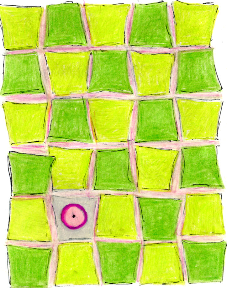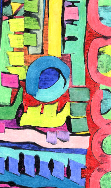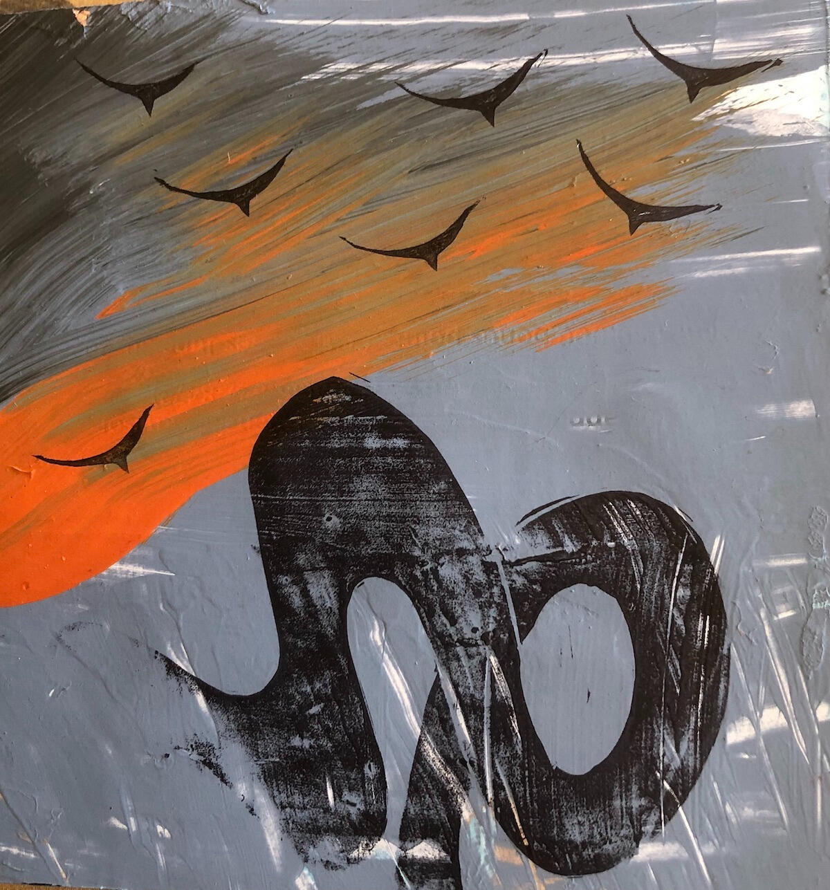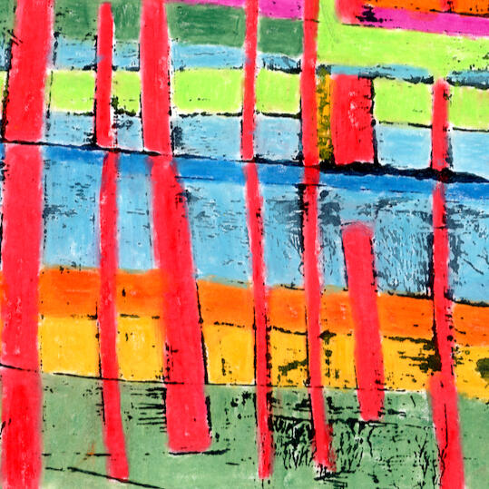 Blank book cover made with used packaging, random acrylic colors added along with rubber stamping